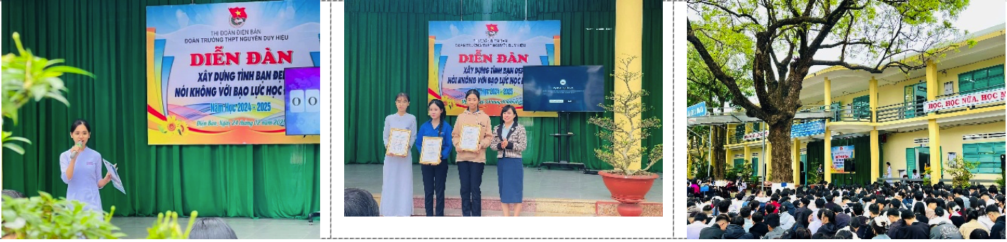 Sáng ngày 24/02/2025, Đoàn trường THPT Nguyễn Duy Hiệu tổ chức diễn đàn với chủ đề “Xây dựng tình bạn đẹp - Nói không với bạo lực học đường”. Chương trình nhằm nâng cao nhận thức của học sinh về tác hại của bạo lực học đường và lan tỏa thông điệp về tình bạn, sự tôn trọng và đoàn kết trong môi trường học tập. đầu viết ở đây.